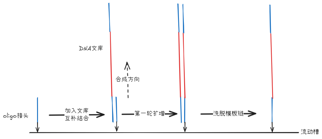 - 由于此时固定在接头上的片段仅靠碱基互补结合,需要先进行一次扩增。扩增产生的子链从与流动槽共价连接的接头开始延伸,因此新合成的子链通过共价键与流动槽紧密连接,而原来的模板链将在液流的冲洗下被洗掉