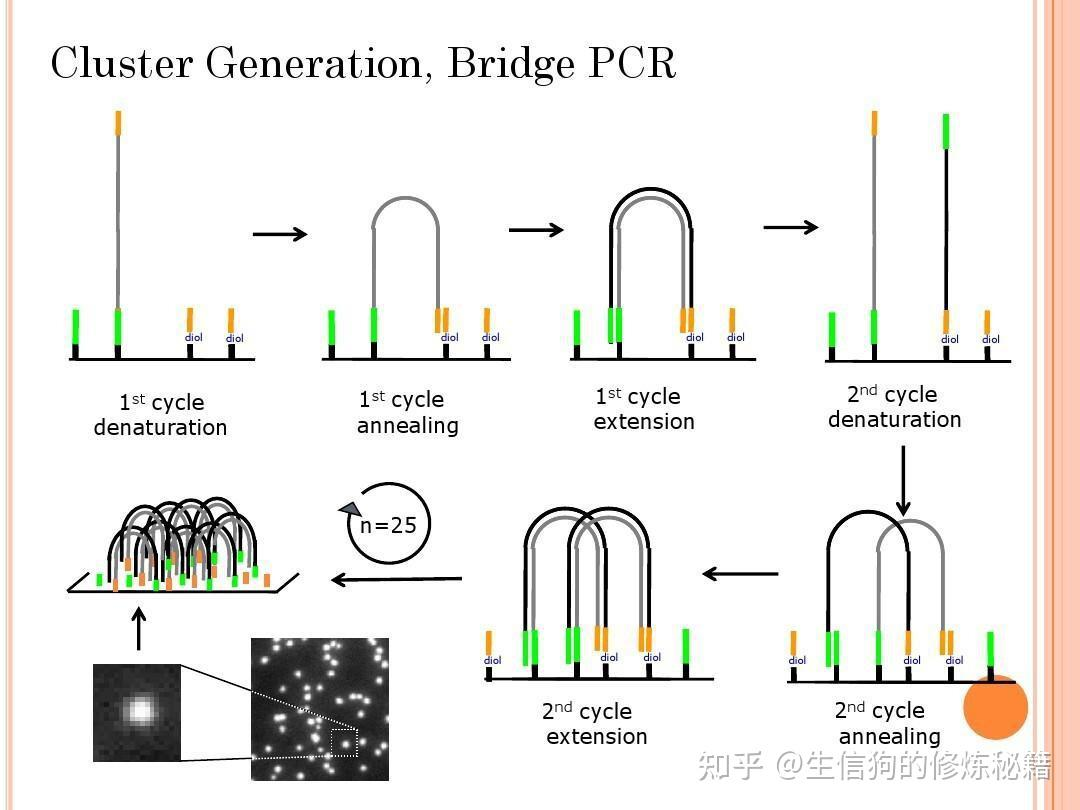- 桥式 PCR 的原理见下图,经 25 个循环后,产生 5000-10000 个拷贝。由于这是一种固相 PCR,以同一模板产生的子链都聚集在一起,产生了 DNA 簇。就像培养基上的菌落一样,每一个簇就是一个序列的单克隆。