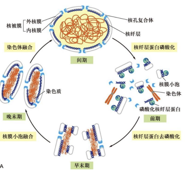 众所周知,核膜的稳定性由一类中间丝—— 核纤层 ——维持。因此,为使得核膜解聚以释放凝缩的染色体,需要破坏核纤层蛋白的稳定性。这一目的通过磷酸化实现。