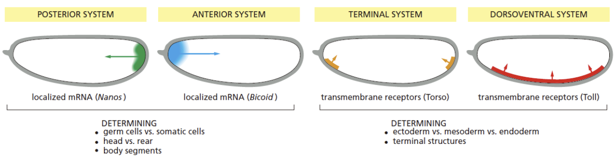 2. 区域性分布的基因产物 (mRNA, 受体等) 决定了特定区域细胞的分化. 也就是说, 在果蝇的第一次卵裂结束后, 细胞的分化也开始了.