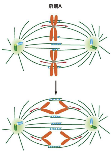 在后期 A,染色单体分离,并向两级运动。动粒微管变短,牵动染色体向两极运动。