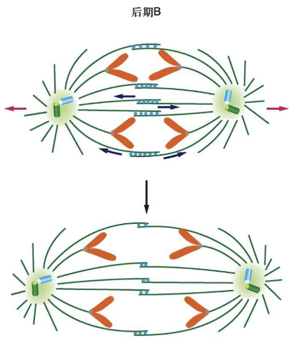 在后期 B,两个纺锤体极分离,使染色体进一步向两级分离。极间微管变长,两级之间的距离逐渐拉长。