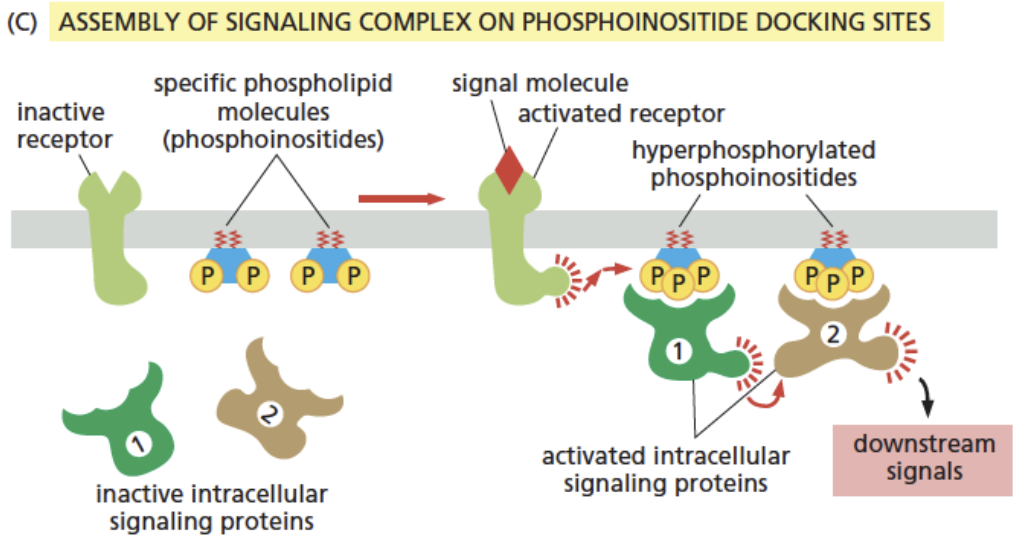 磷脂酰肌醇(PI)是一种重要的磷脂(见膜脂的分类)。受体结合胞外信号被激活后,在邻近质膜上形成修饰的肌醇磷脂分子,从而募集并装配信号复合物