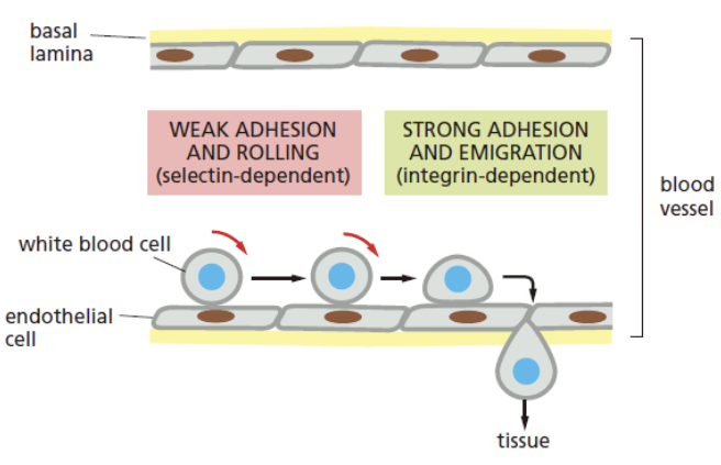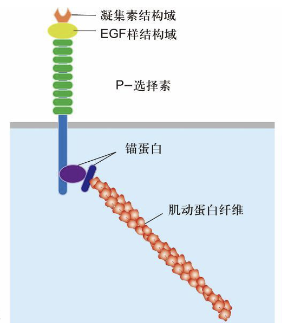 selectin 选择素(selecting)是一种异亲型结合细胞黏着分子,要也是一种钙离子依赖的细胞黏着分子. 特异性 胞外部分具有高度保守并能识别其他细胞表面特异性寡糖链的凝集素(lectin)结构域。 选择素不像钙黏蛋白和整联蛋白那样可以介导连接,而只能介导弱黏着,这使得细胞可以进行滚动性运动。选择素与各种免疫细胞相关: L-选择素位于 WBC 表面 E-选择素位于血管内皮细胞表面 P-选择素位于血小板和内皮细胞