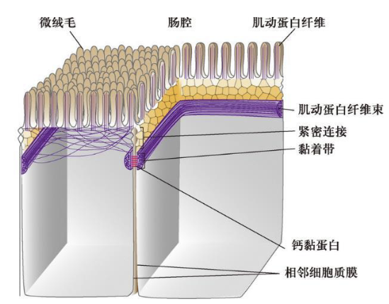 微丝胞间连接 黏着带是锚定连接中的一种特殊类型。当细胞与细胞间通过微丝和钙黏蛋白相连时,将形成一个连续的带状结构。 这种带状结构在细胞连接中都是相对少见。因此,这种结构也有其特殊功能:能促进上皮细胞层弯曲形成神经管等结构。