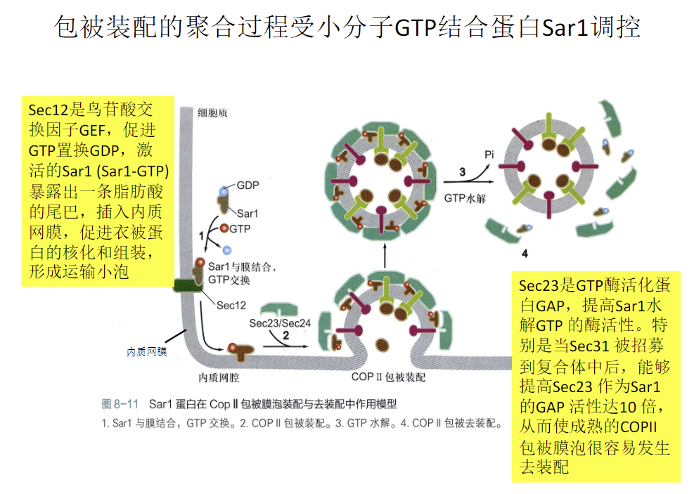 - 细胞中游离的 Sar1-GDP 与 ER 膜上的 Sec121 互作,促进 GDP 置换为 GTP,激活 Sar1