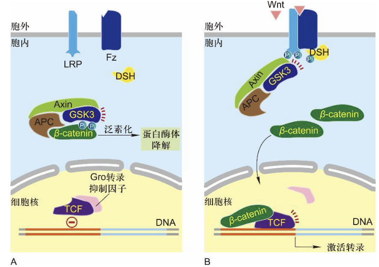 β-Catenin 是转录调控蛋白,在胞质中稳定积累后,开启 Wnt 信号通路
