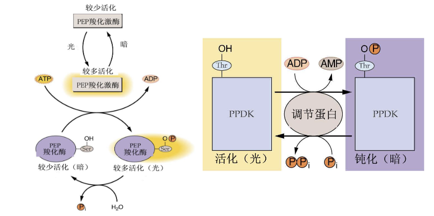 光对酶活性调节 PEPC, NADP-苹果酸脱氢酶,PPDK(丙酮酸磷酸激酶) 都是光活化酶 PEPC受光依赖的磷酸化 和去磷酸化调节 光对酶量的调节 Rubisco,PEPC 的合成受光控制或诱导 代谢物的运输 BSC 中合成的光合产物可以快速运输至维管束,避免光合产物的累积